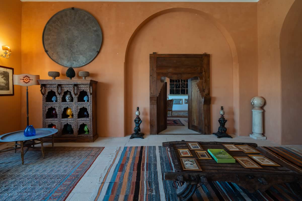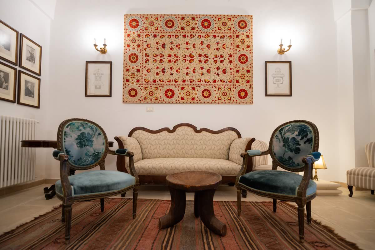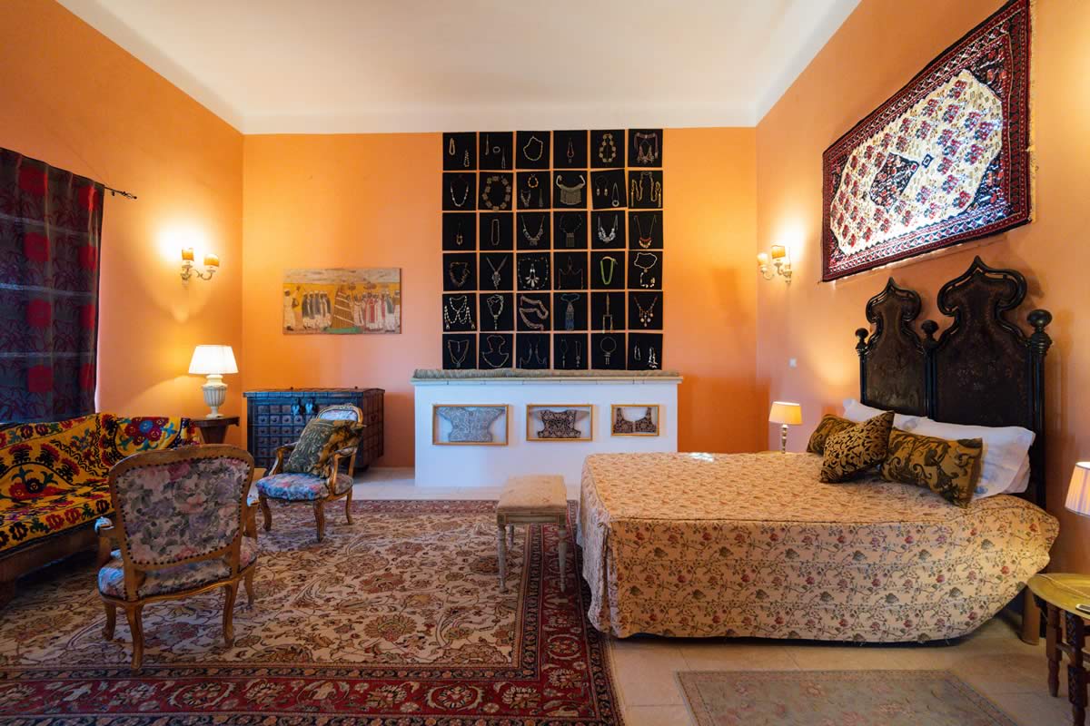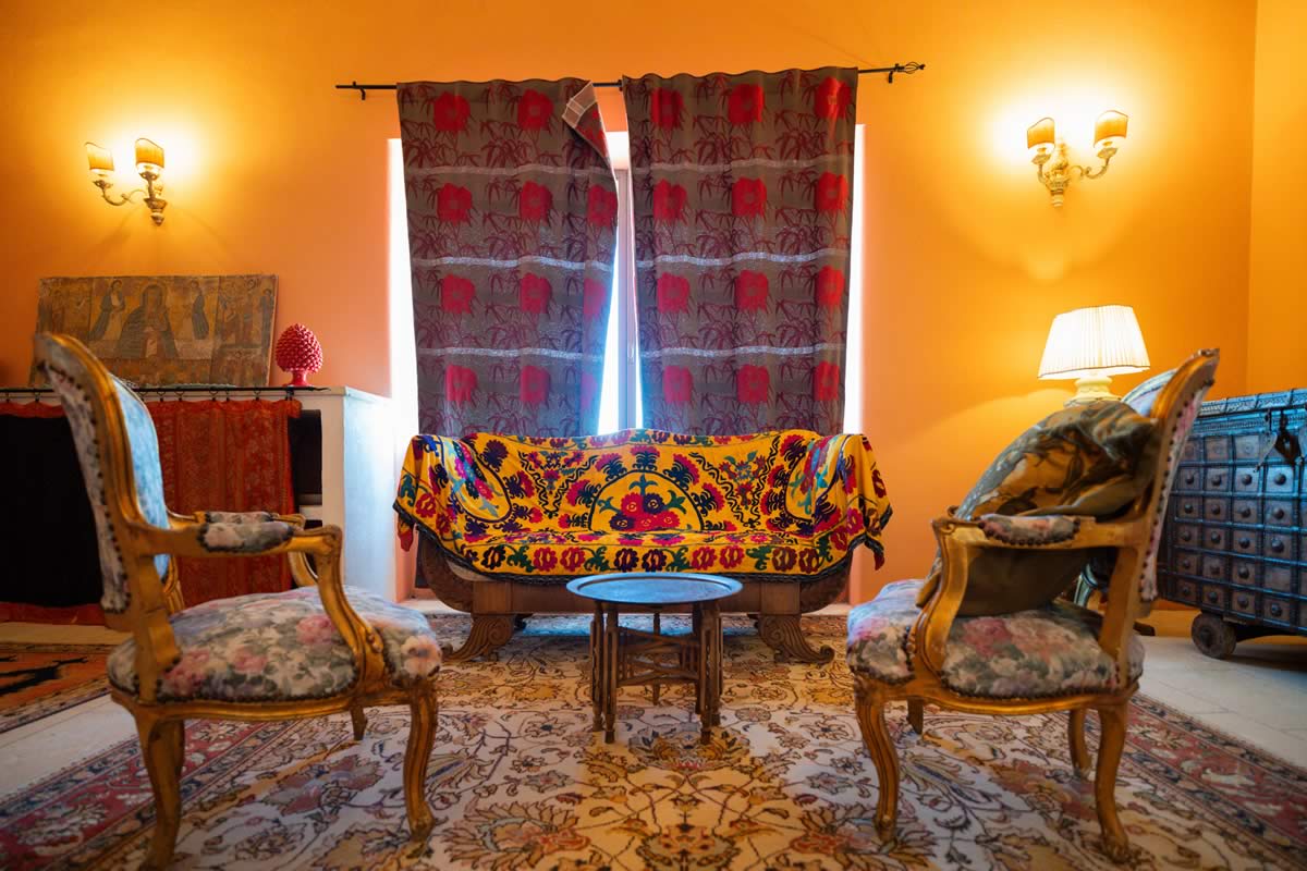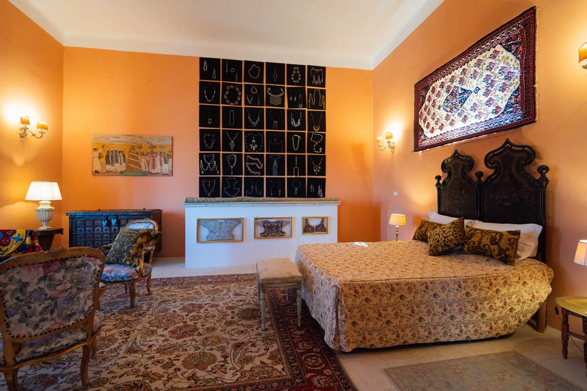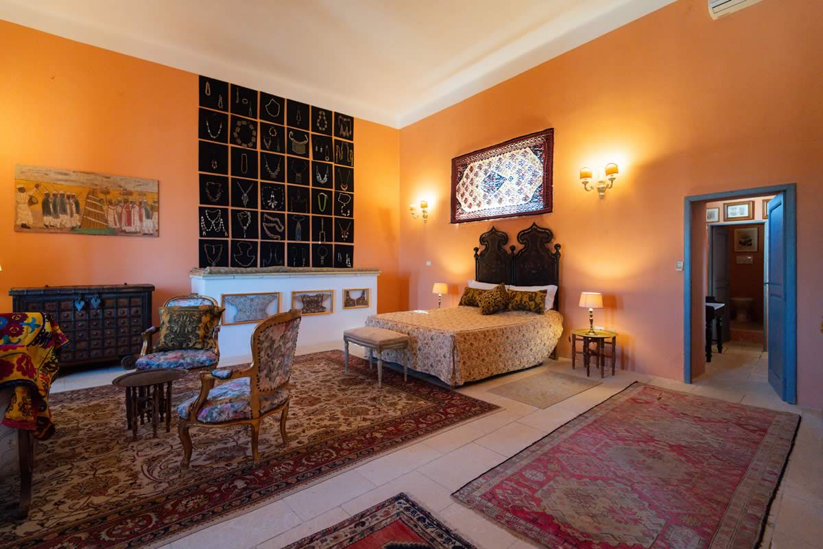 L’accesso avviene attraverso un portone in legno indiano, intagliato, imponente ed esotico: un ingresso che ha qualcosa di faraonico, solenne, quasi scenografico. All’interno, la luce accarezza gli arredi etnici, i tappeti, le opere artigianali e gli oggetti che i proprietari hanno raccolto nei loro viaggi. La camera è spaziosa e dotata di un accogliente salottino privato, perfetto per leggere, rilassarsi o gustare un tè in totale tranquillità. Il bagno privato rende l’ambiente ancora più confortevole.