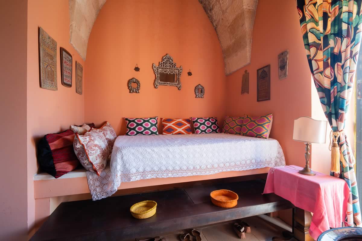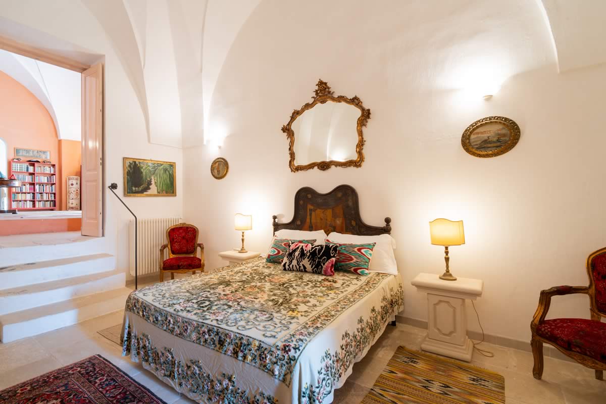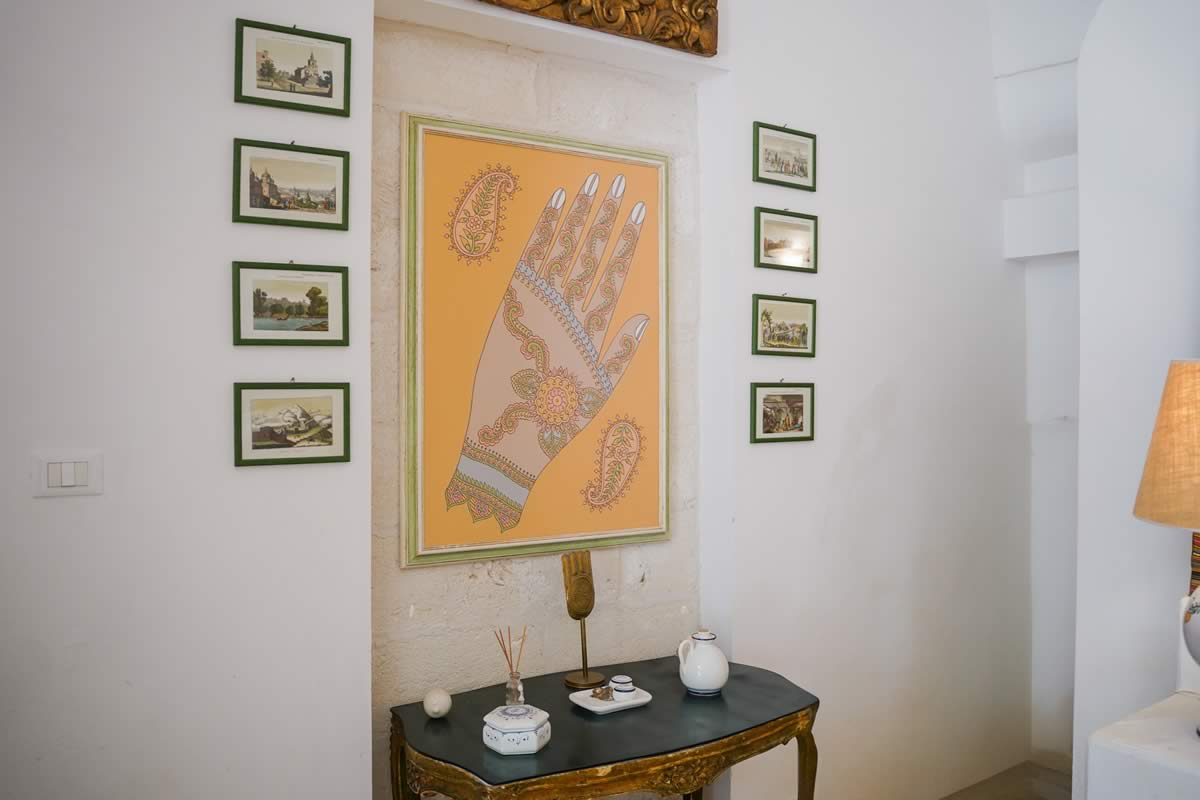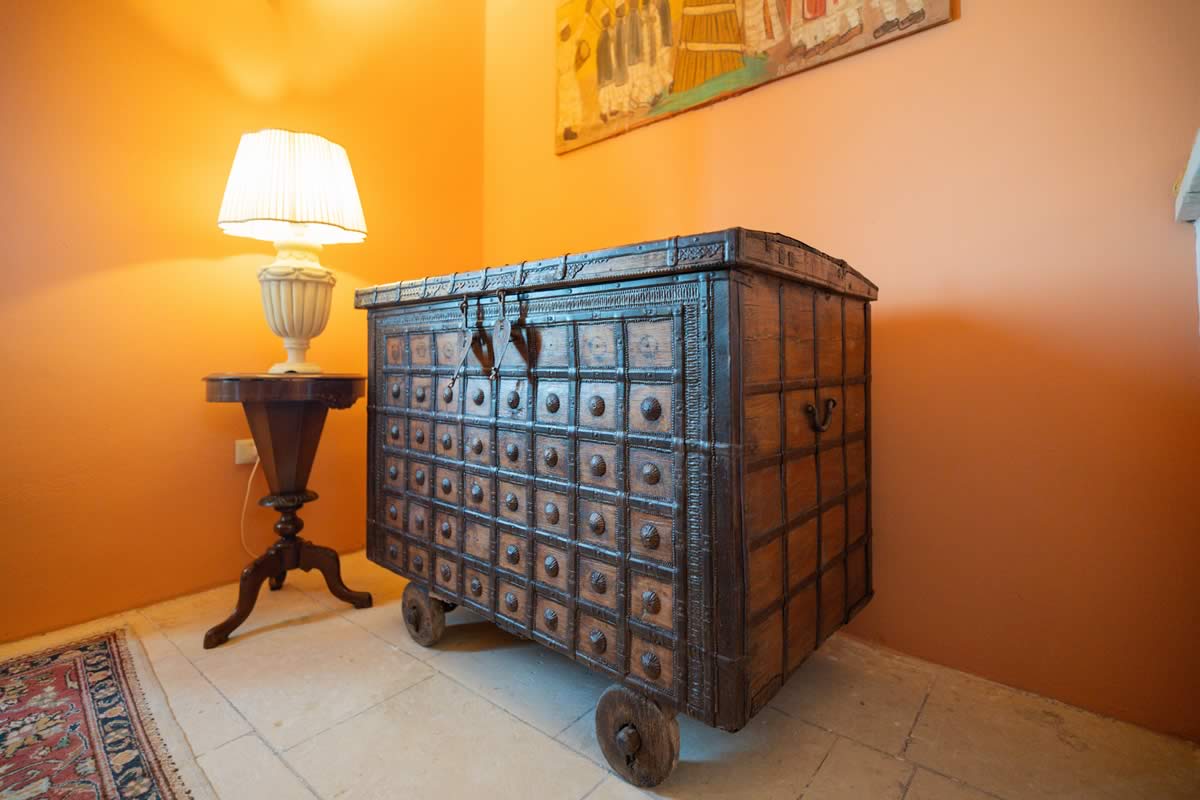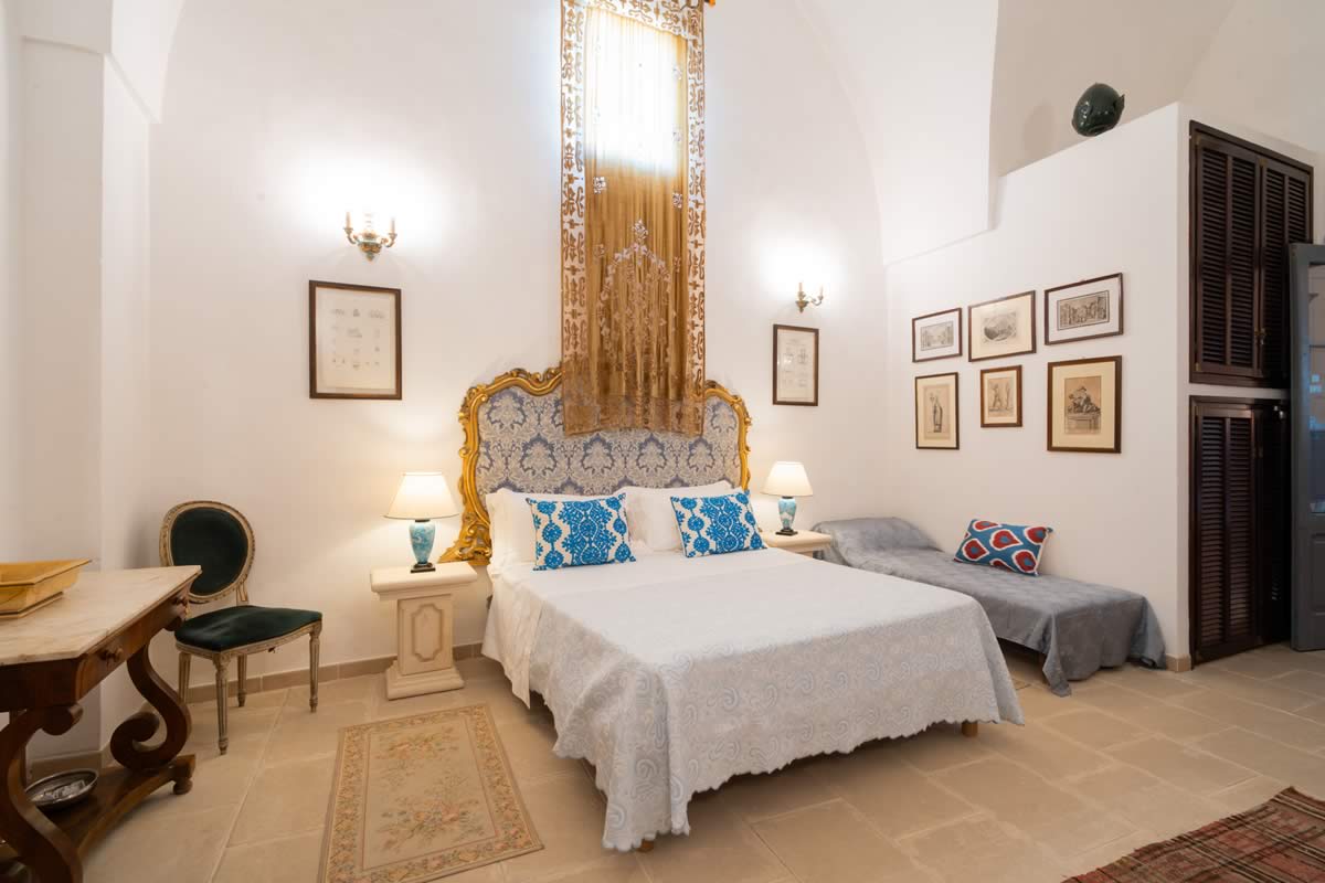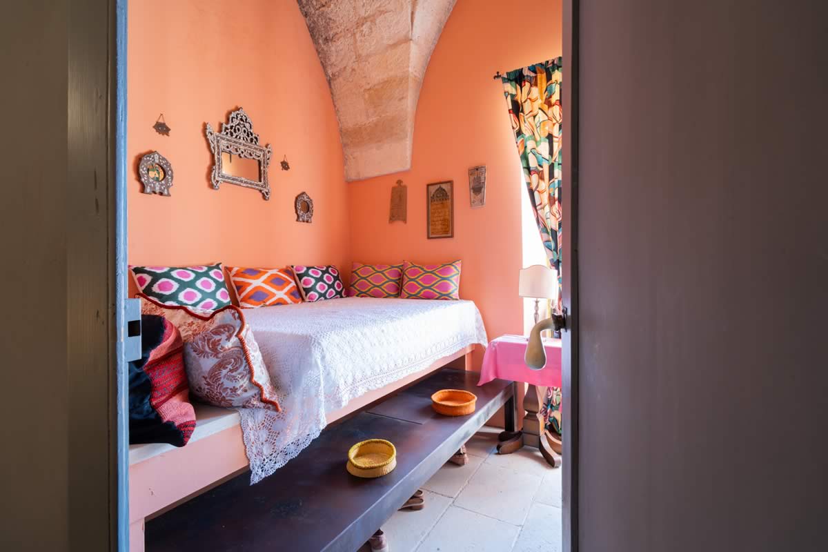 L’accesso avviene attraverso un portone in legno indiano, intagliato, imponente ed esotico: un ingresso che ha qualcosa di faraonico, solenne, quasi scenografico. All’interno, la luce accarezza gli arredi etnici, i tappeti, le opere artigianali e gli oggetti che i proprietari hanno raccolto nei loro viaggi. La camera è spaziosa e dotata di un accogliente salottino privato, perfetto per leggere, rilassarsi o gustare un tè in totale tranquillità. Il bagno privato rende l’ambiente ancora più confortevole.