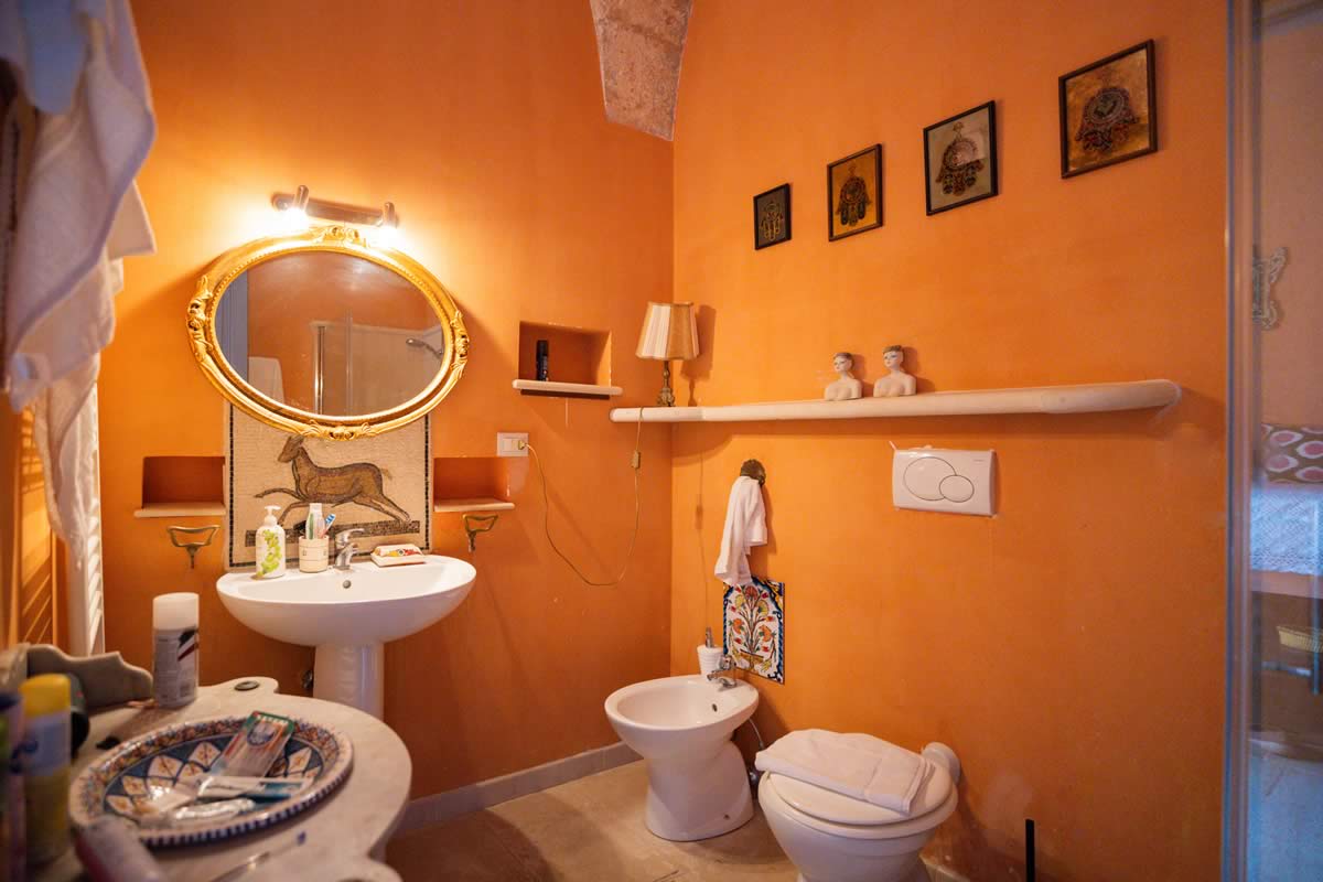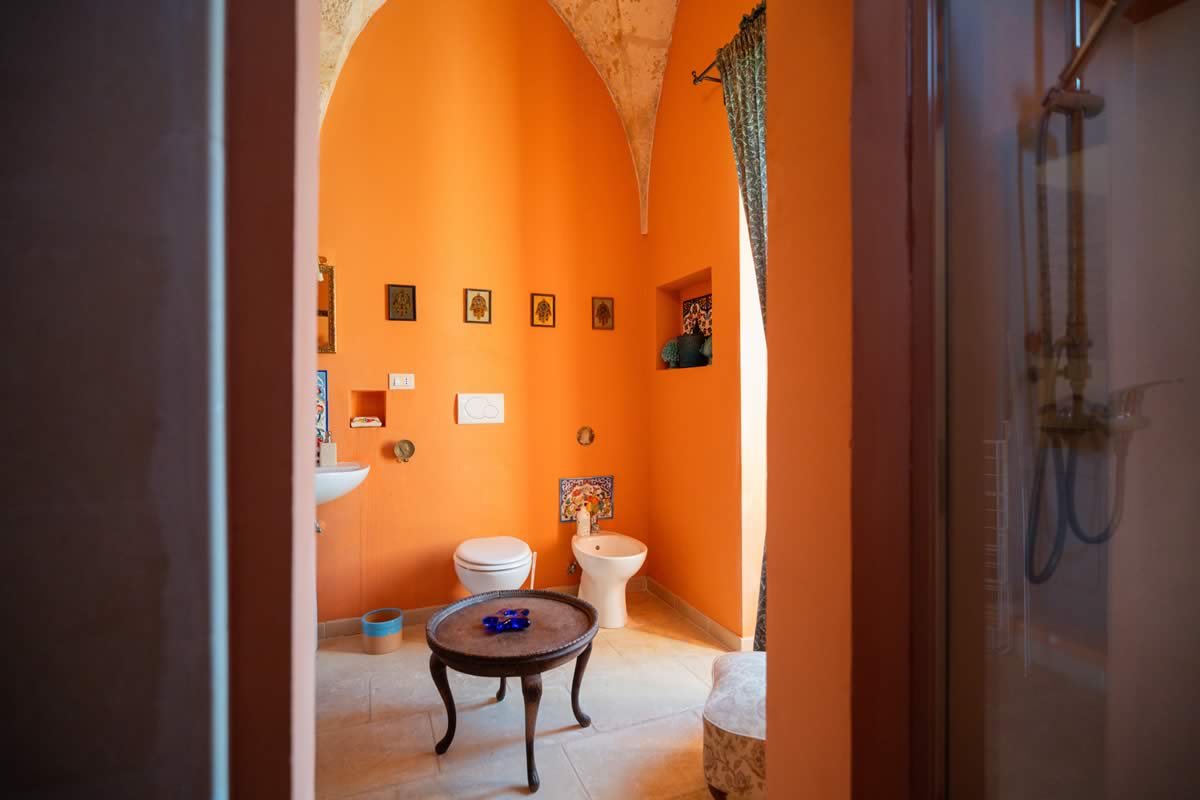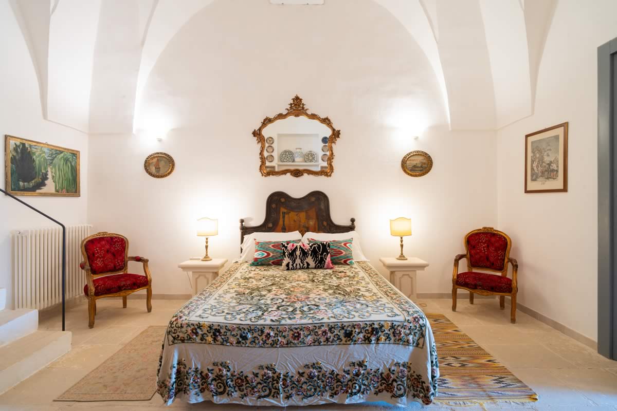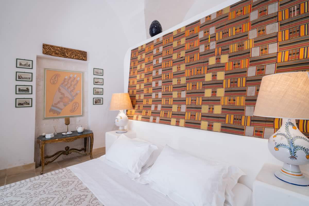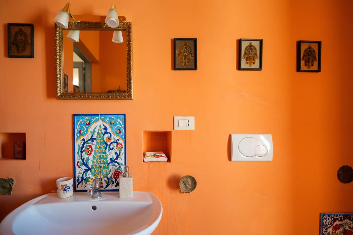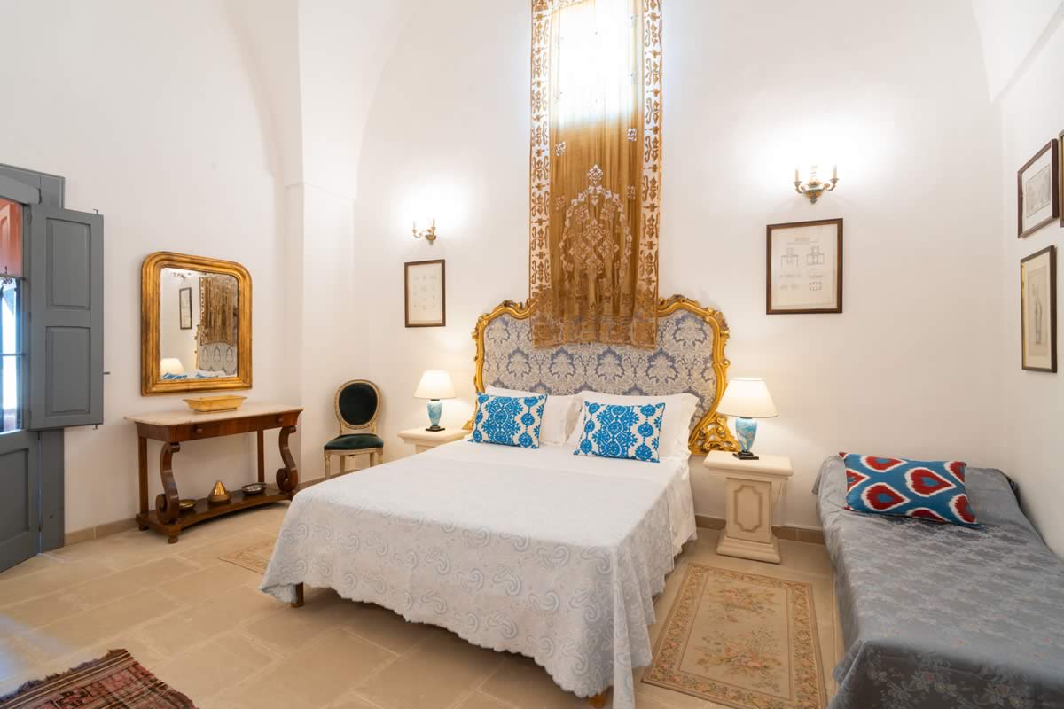 L’accesso avviene attraverso un portone in legno indiano, intagliato, imponente ed esotico: un ingresso che ha qualcosa di faraonico, solenne, quasi scenografico. All’interno, la luce accarezza gli arredi etnici, i tappeti, le opere artigianali e gli oggetti che i proprietari hanno raccolto nei loro viaggi. La camera è spaziosa e dotata di un accogliente salottino privato, perfetto per leggere, rilassarsi o gustare un tè in totale tranquillità. Il bagno privato rende l’ambiente ancora più confortevole.
