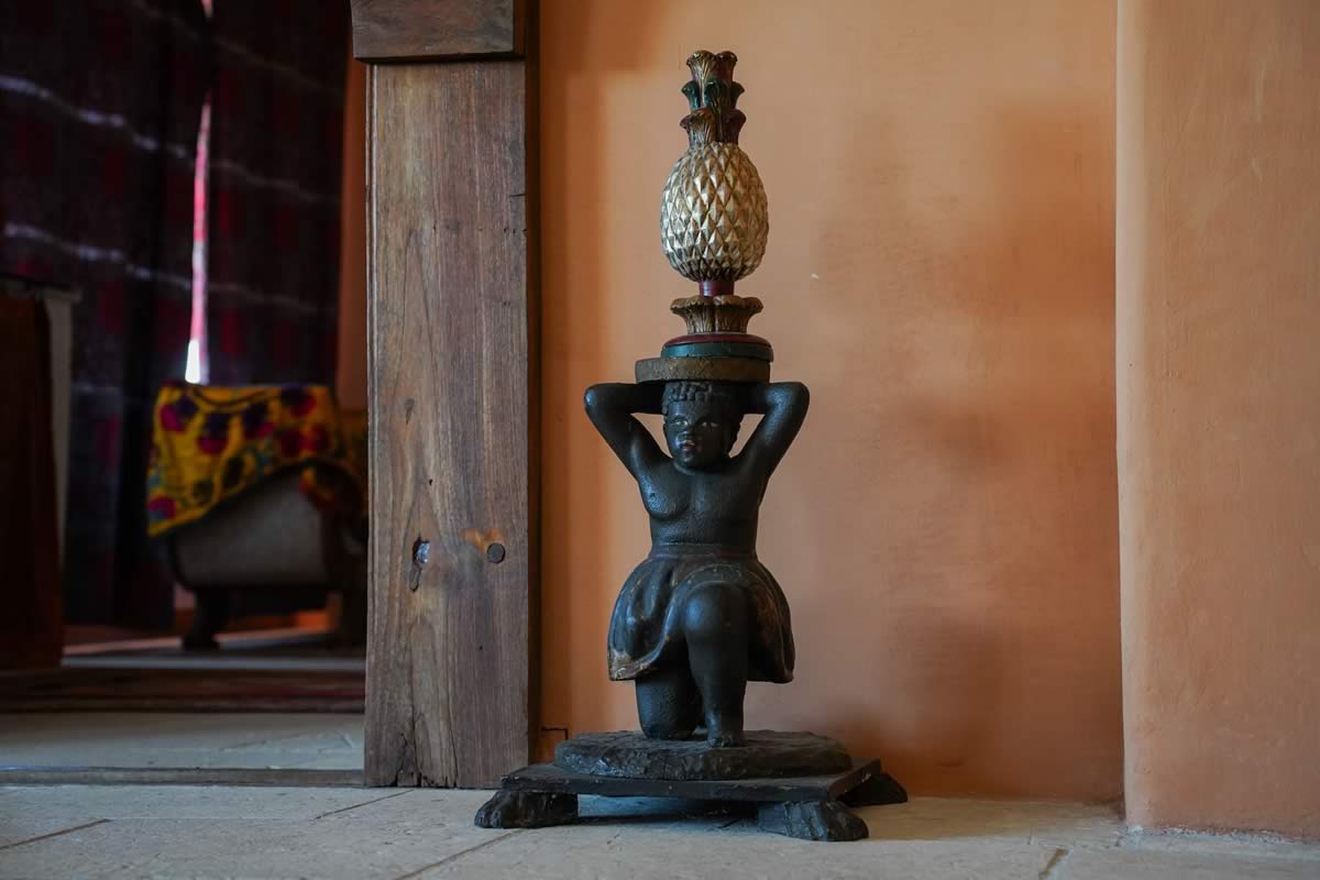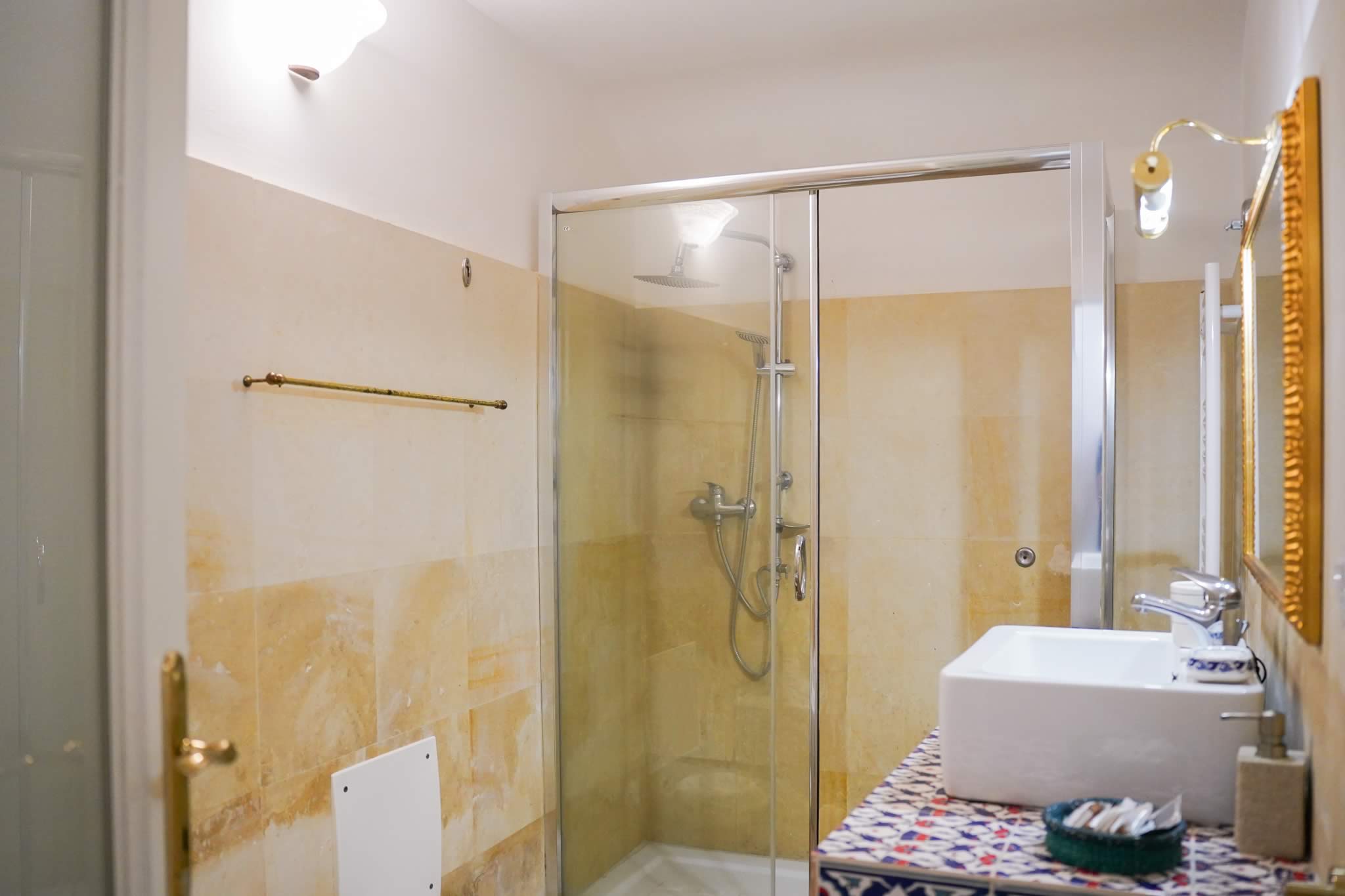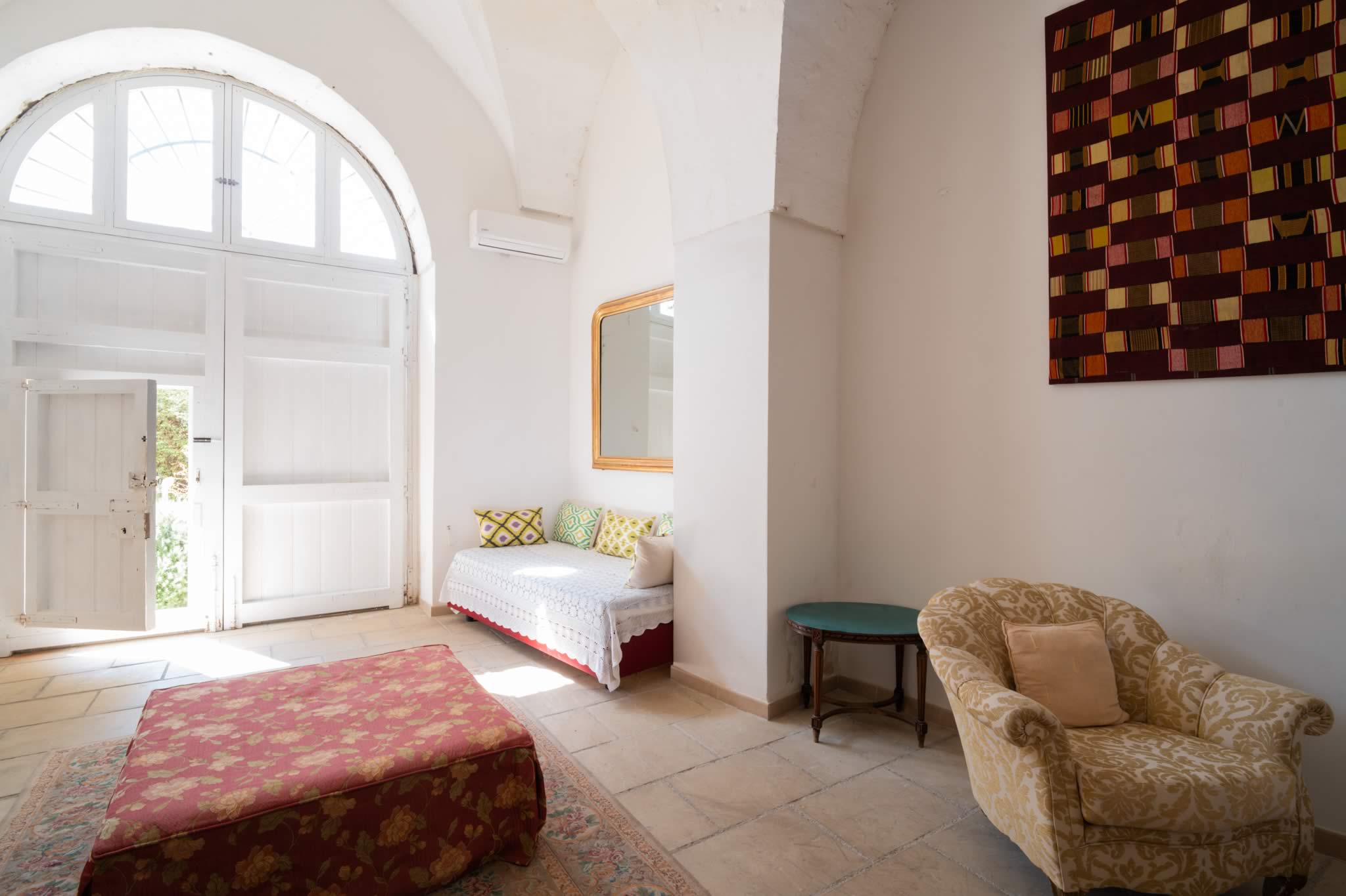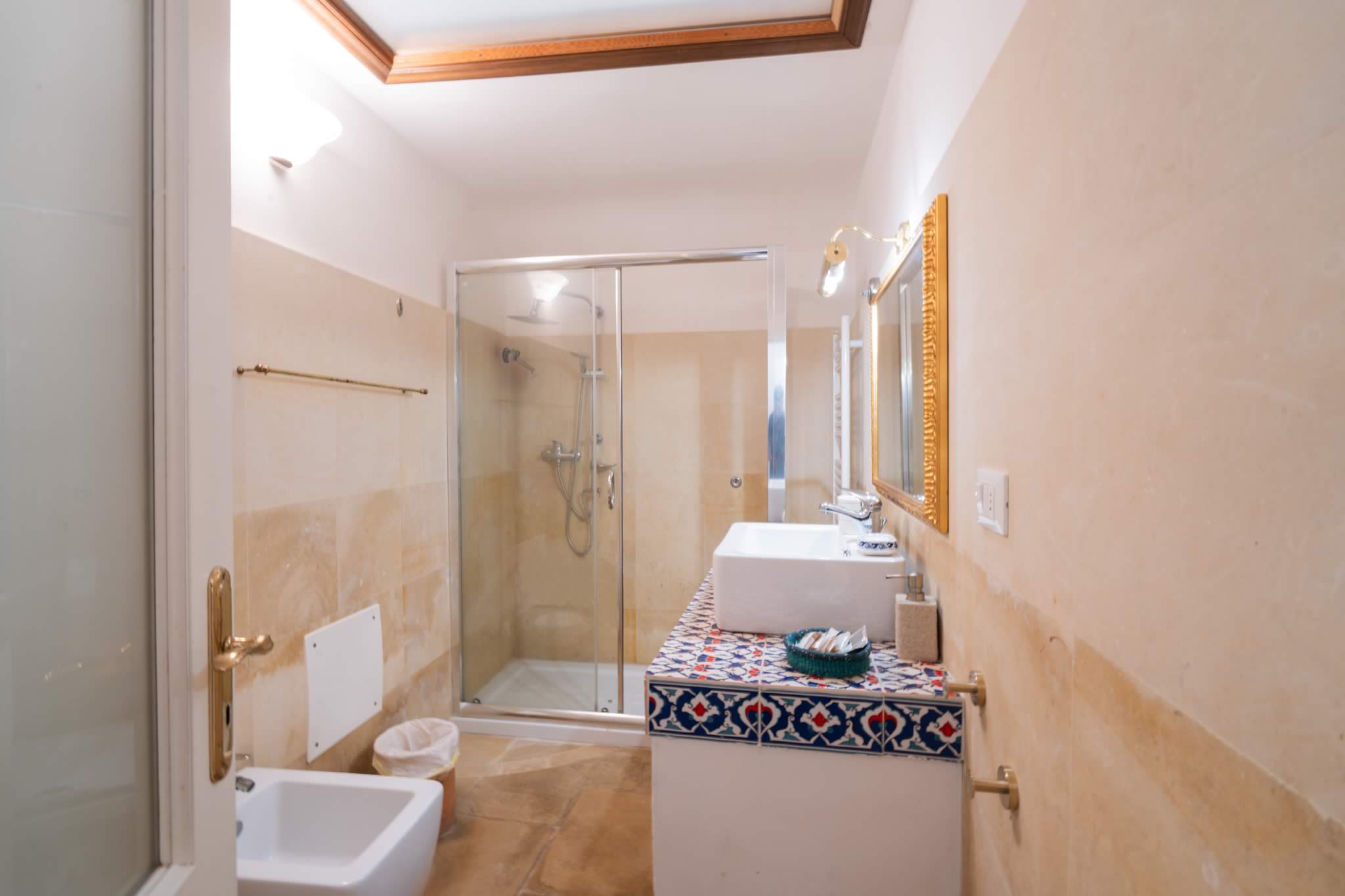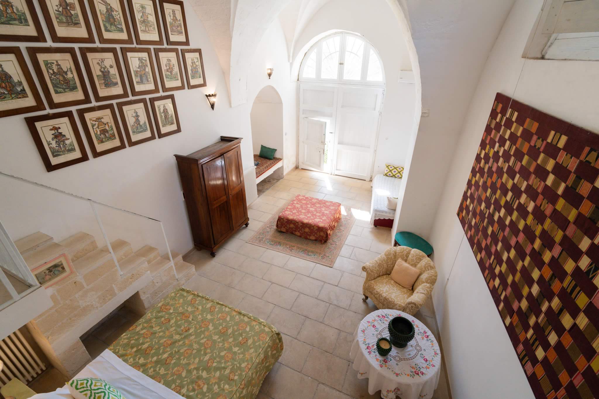 L’accesso avviene attraverso un portone in legno indiano, intagliato, imponente ed esotico: un ingresso che ha qualcosa di faraonico, solenne, quasi scenografico. All’interno, la luce accarezza gli arredi etnici, i tappeti, le opere artigianali e gli oggetti che i proprietari hanno raccolto nei loro viaggi. La camera è spaziosa e dotata di un accogliente salottino privato, perfetto per leggere, rilassarsi o gustare un tè in totale tranquillità. Il bagno privato rende l’ambiente ancora più confortevole.
