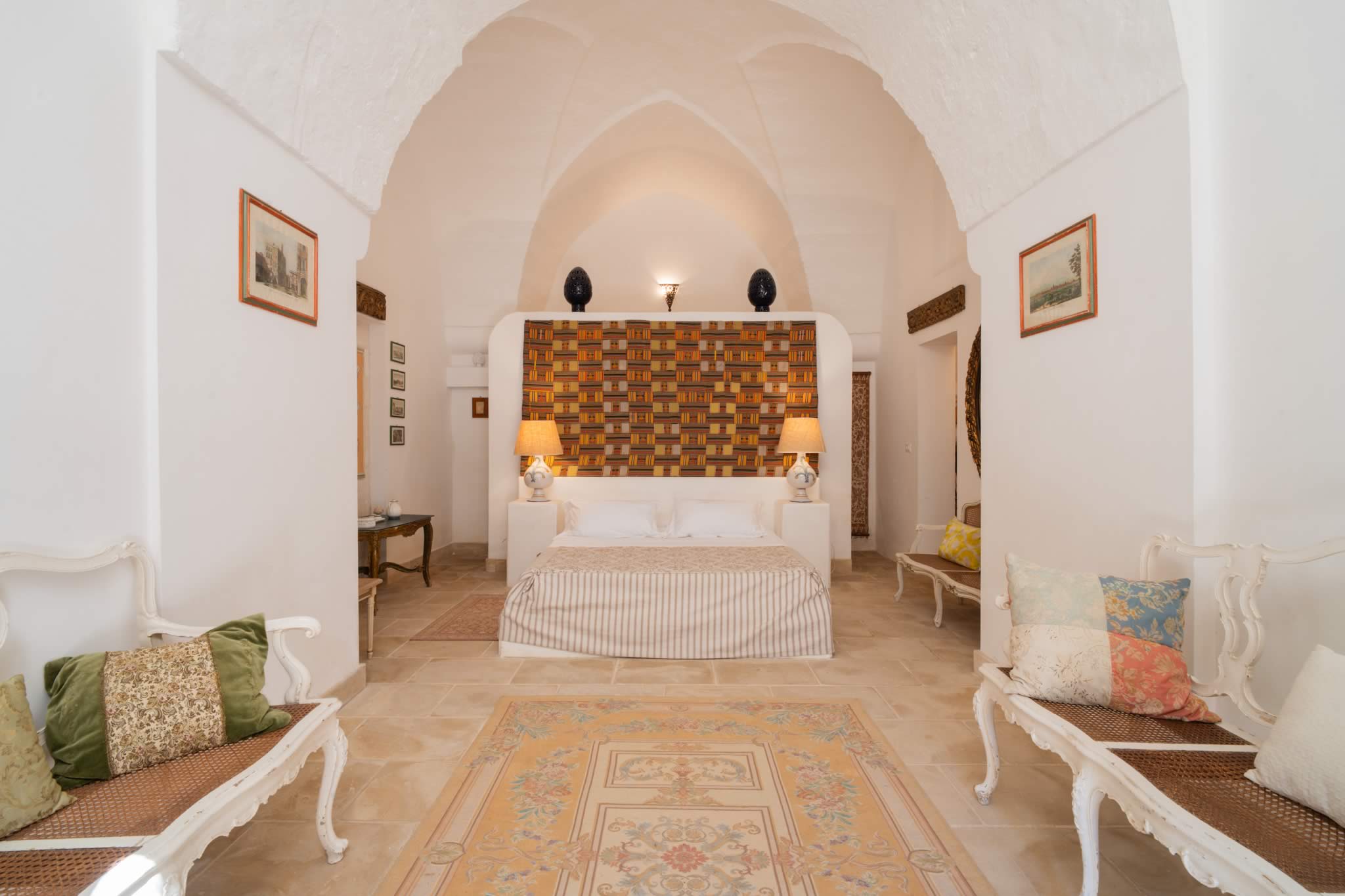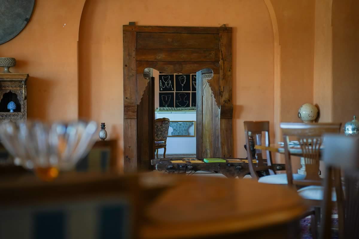 L’atmosfera è calda, intima, quasi teatrale: muri spessi, luci soffuse, oggetti etnici e dettagliche ricordano le case antiche del Mediterraneo.